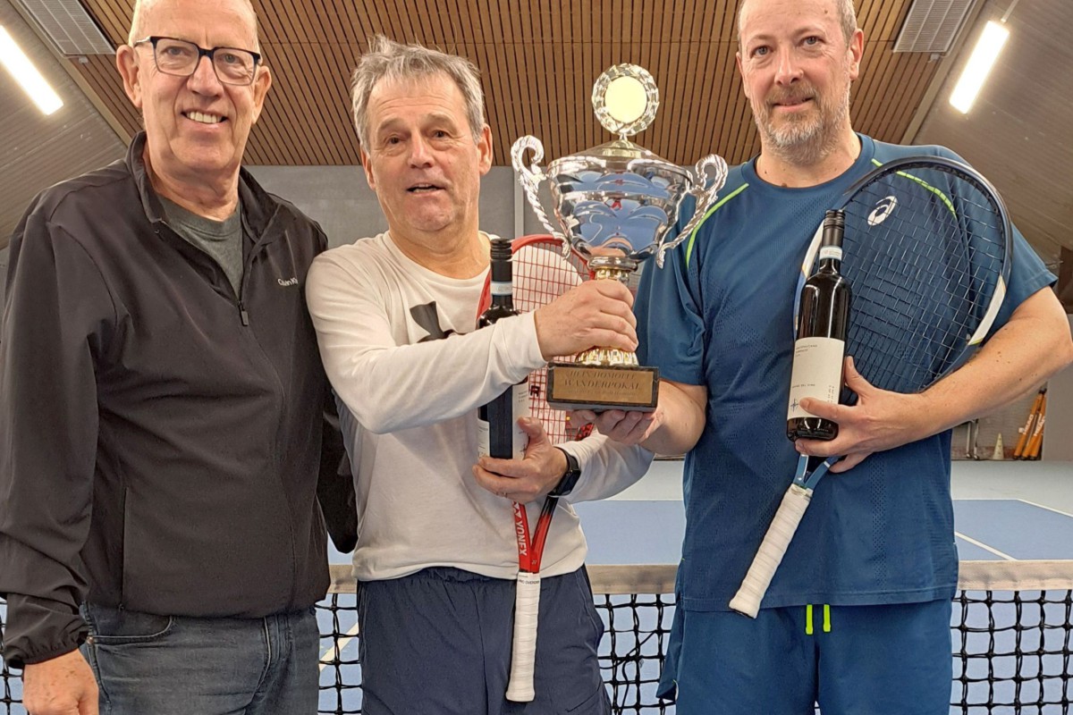 Hier ist er, der Homölle-Pokal – gewonnen von Ralf Kalkbrenner (Mitte) und Doppelpartner Wilbert Jochims, überreicht von Rolf Homölle. -
