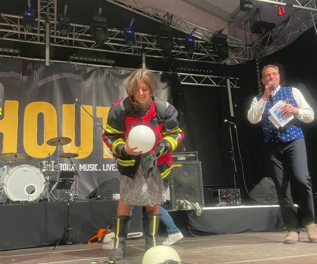 - Koordiniertes Multitasking wurde in Disziplin zwei getestet: Teile einer Feuerwehr-Montur anziehen und nebenbei Luftballon in der Luft halten! Tennisspieler gegen Fußballer; TCG zieht an — und an den Fußballern elegant vorbei; jetzt schnell das letzte Utensil, der Helm; geschafft! Nur, der Helm lag am Boden. 1:0 für die Fußballer.