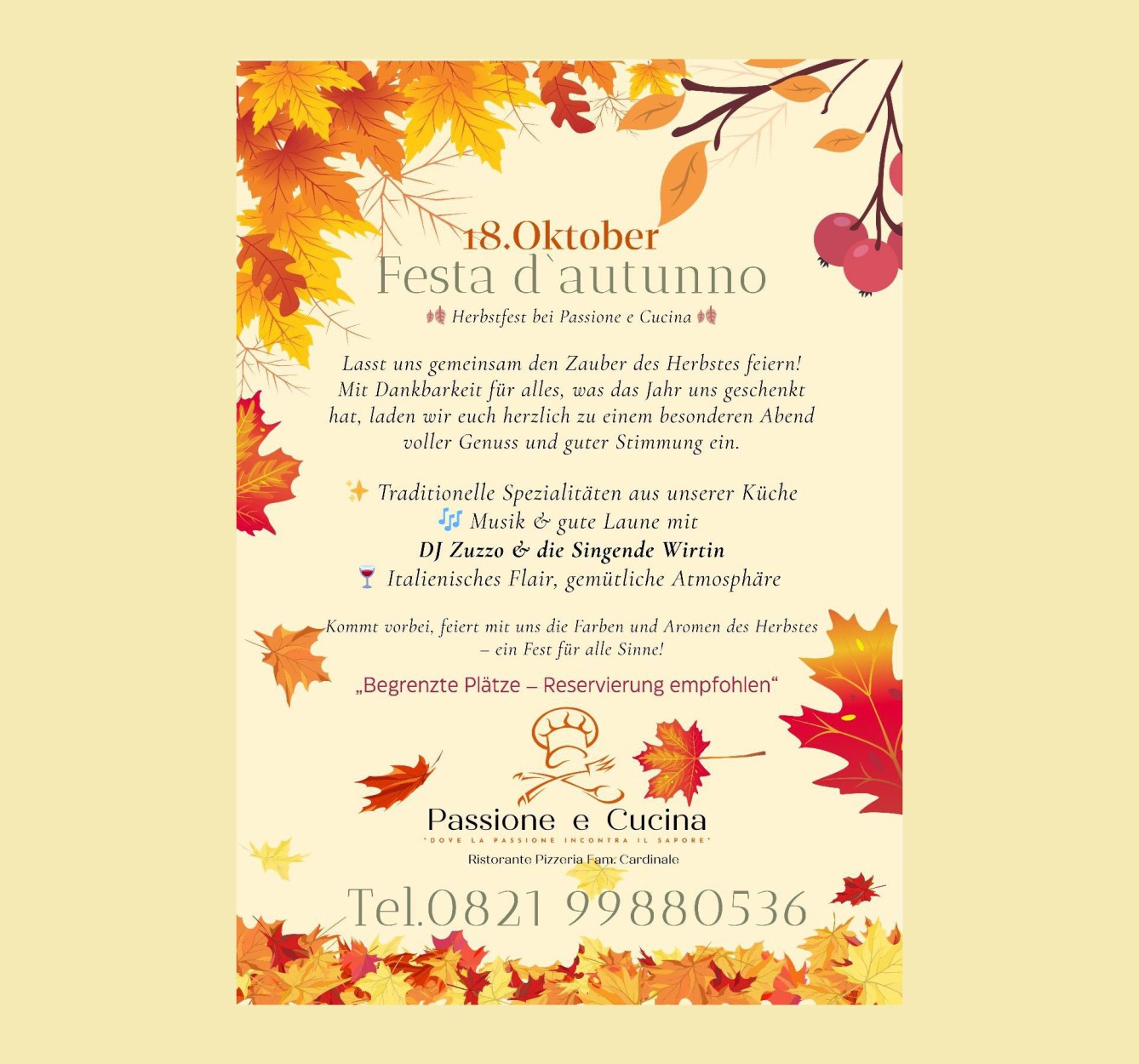 Bevor der Herbst sein buntes Kleid verliert und Nebelschwaden über den Platz ziehen, lädt unsere Wirtsfamilie am 18. Oktober zum fröhlichen Herbstfest ein: gute Laune, feines Essen, coole Musik - perfetto!