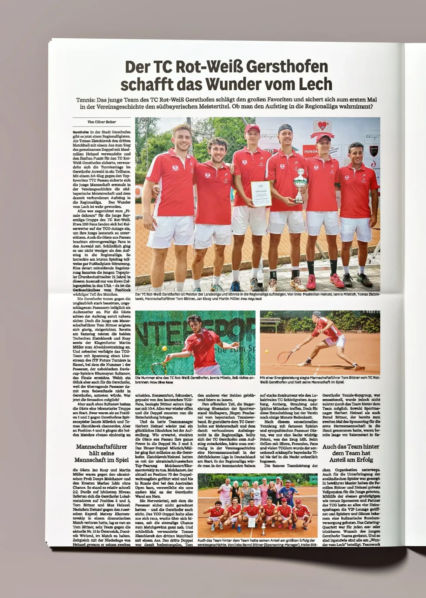 Was für ein Jahr! In der Saison 2023/2024 gelang unserem Herren-1-Team ein historischer Erfolg: Mit dem Gewinn der südbayerischen Mannschaftsmeisterschaft feierte der TCG den bislang größten Triumph seiner Geschichte. Passend dazu titelte die Augsburger Allgemeine in ihrer Landausgabe vom 17. Juli 2024: „Der TC Rot-Weiß Gersthofen schafft das Wunder vom Lech.“ Am letzten, entscheidenden Spieltag besiegte das Team um Mannschaftsführer Tom Bittner völlig überraschend den bis dahin ungeschlagenen Tabellenführer – und machte das scheinbar Unmögliche wahr: Bayernliga-Meister! Aufstieg in die Regionalliga!